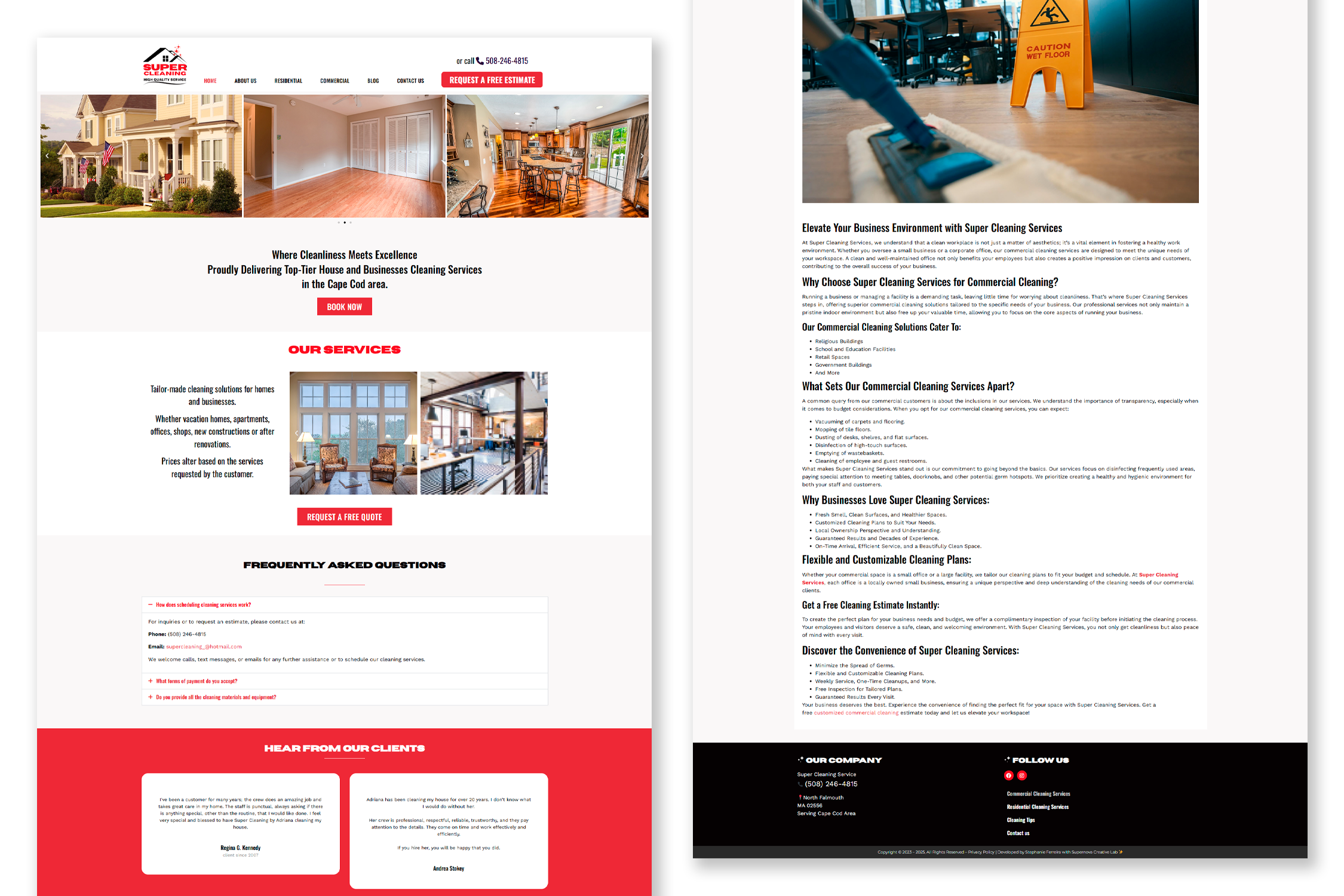 O site da Super Cleaning CC foi desenvolvido para uma empresa de limpeza residencial e comercial nos Estados Unidos. O principal desafio desse projeto foi trabalhar com duas cores muito fortes — preto e vermelho — e com uma tipografia marcante, sem perder a clareza, a organização visual e a sensação de confiança que um serviço desse segmento precisa transmitir.